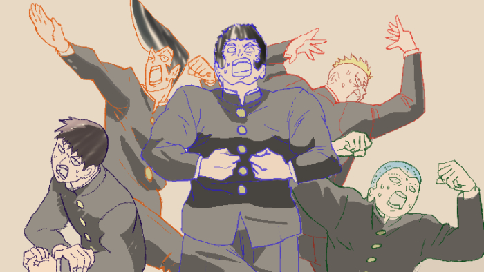 2019-03-18 今日のお絵かき018 お絵かき 『モブサイコ100』肉体改造部の先輩方をトレースしました。 左から山村、志村、郷田、隈川、佐川。隈川くんの手がいいよね。目が点でいいので描きやすいのです。